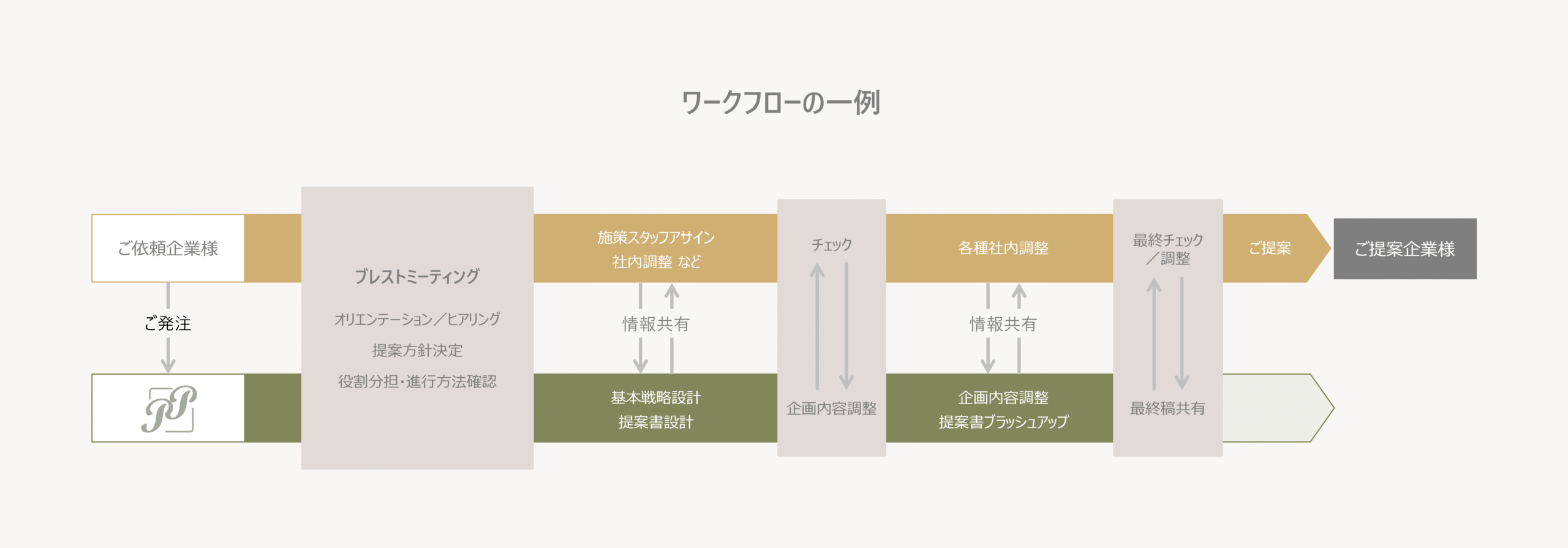 下記は、受託後の主な業務フローとなります。ご依頼企業様ごとに企画業務の内容やチーム体制等が異なるため、