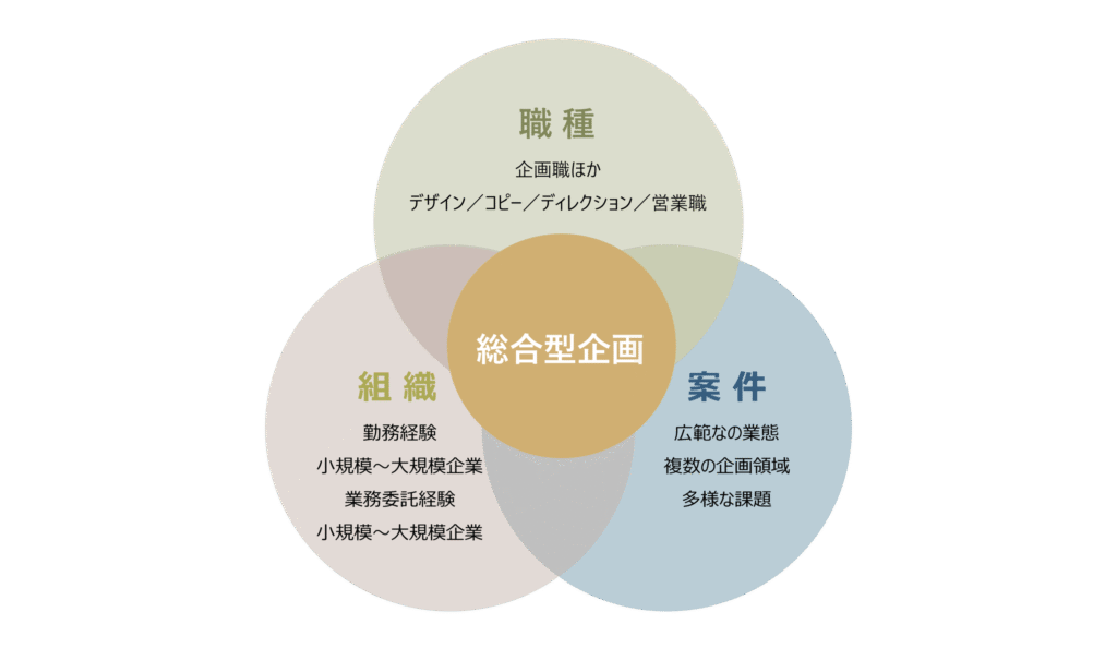 わたしが社会人として歩み始めた1980年代後半から90年代初頭は、男女雇用均等法の施行やバブル経済の崩壊、リストラによる終身雇用制度の変化など、労働環境が大きく揺れ動いた時代でした。こうした変化を前に、どんな環境でも自分で考え舵取りができる「自律的なキャリア」を意識するようになりました。20代は広告業界で、営業・制作・ディレクション・企画を幅広く経験し、その後は専門領域を企画職に集中。現場経験に基づいた視点を強みに、多様な案件に取り組んできたことが、現在のキャリアにつながっています。